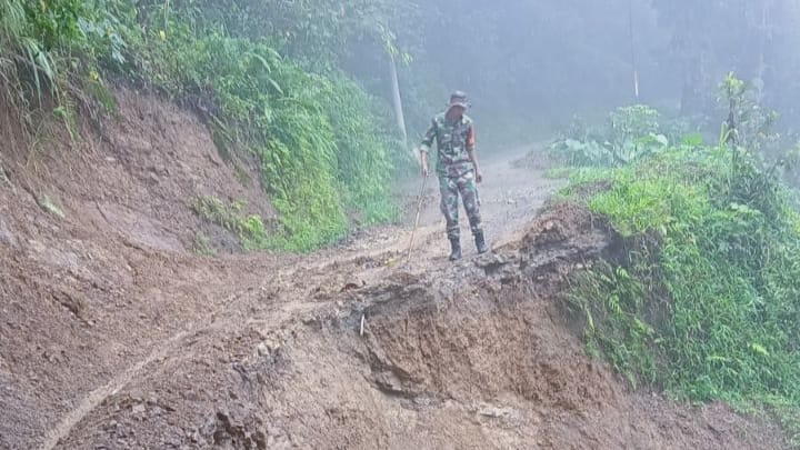 “Ia benar terjadi tanah longsor yang juga membuat jalan ikut amblas akibat terbawah material tanah, sehingga arus transportasi lumpuh,” Terang Kapten. Inf. Safri Dasi, Danramil Sanggalangi.