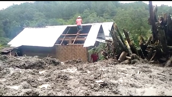 “Kejadian saat hujan redah, tiba – tiba terdengar bunyi gemuruh saat kami sedang tertidur, saya langsung menarik anak saya untuk menyelamatkan diri, setelah tenang saya lihat rumah sudah rusak tepat dikamar karena tertimpa pohon, sementara bagian dapur jebol akibat terkena akar bambu yang terbawa tanah longsor. Terang Meri Pabia’ Korban Longsor.