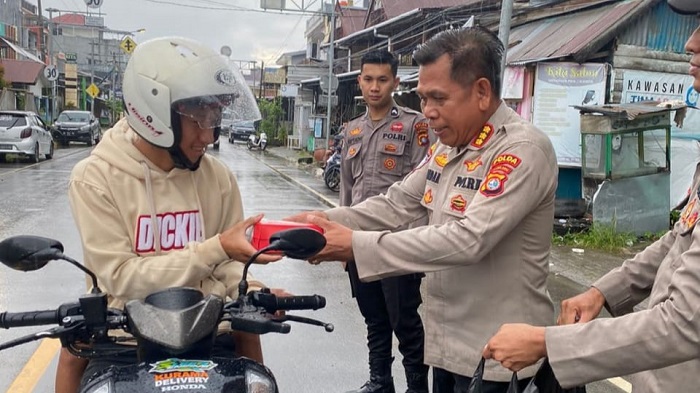 Ket Foto : Kombes Pol Andarias. Dir Binmas Polda Sulbar Saat Membagikan Takjil Kepada Pengendara