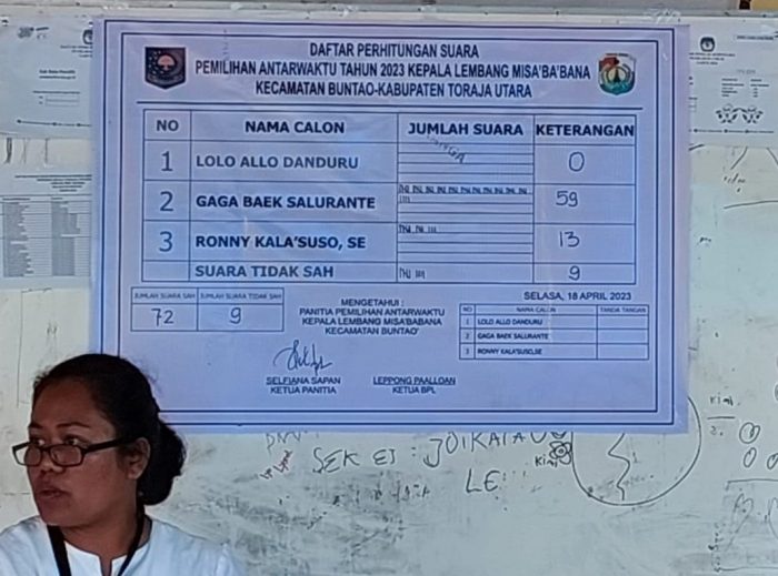 Toraja Utara, ||Jurnaltivi.com|| Pemilihan Antar Waktu di Lembang Misa’ Ba’bana, Kecamatan Buntao, Kabupaten Toraja Utara, Provinsi Sulawesi Selatan, Selasa,18/4/2023. Sukses digelar, Gaga Baek Salurante, Jadi Pemenang.