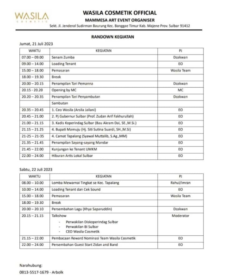 Kegiatan tersebut berlangsung 21-22 Juli 2023 di Lapangan Bagea Galung, Kecamatan Tappalang, Mamuju. Pameran UMKM ini ialah event yang diinisiasi oleh Wasila Cosmetik Official untuk mempromosikan produk skincare terbarunya, termasuk membantu para pelaku UMKM.
