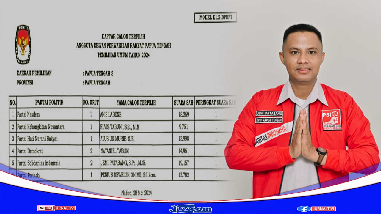 Dalam rapat pleno tersebut Jemi Patabang,S.Pd.,M.Si dari Partai Solidaritas Indonesia (PSI) Daerah Pemilihan Kabupaten Puncak, dinyatakan lolos dengan perolehan suara 19.157, merupakan suara tertinggi dari Kabupaten Puncak dan posisi ke-4 perolehan suara terbanyak di DPR Provinsi Papua Tengah.