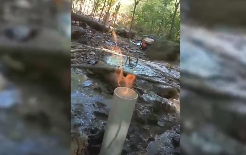 Untuk memastikan bahwa itu gas alam yang keluar dari pipa sumur bor yang digali, salah seorang pekerja sumur memantik ujung pipa dengan korek api, alhasil ujung pipa tersebut menyala.