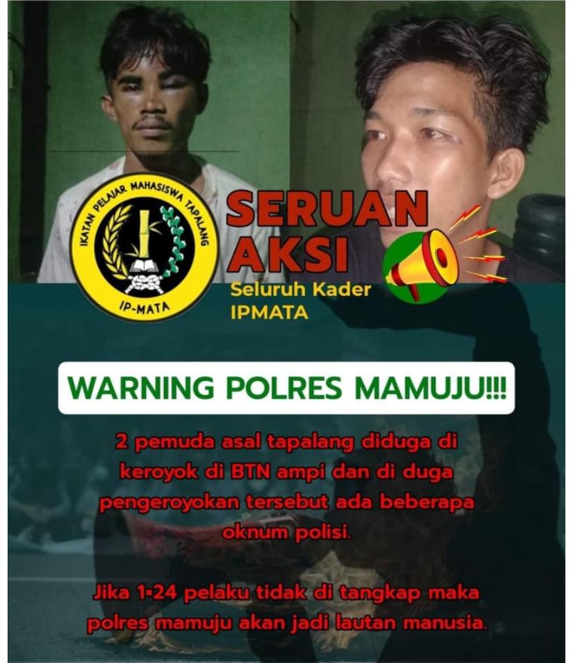 “Dalam akun Meta yang diposting oleh Bobo Arsandyy bersama Dedh, menuliskan seruan aksi kader Ipmata, jika dalam waktu 1X24 jam pelaku pengeroyokan tidak ditangkap oleh polisi. Kantor Polresta Mamuju akan jadi lautan manusia,” ungkap akun Fb Bobo Arsandyy dengan Dacdh yang diposting 5 jam lalu.