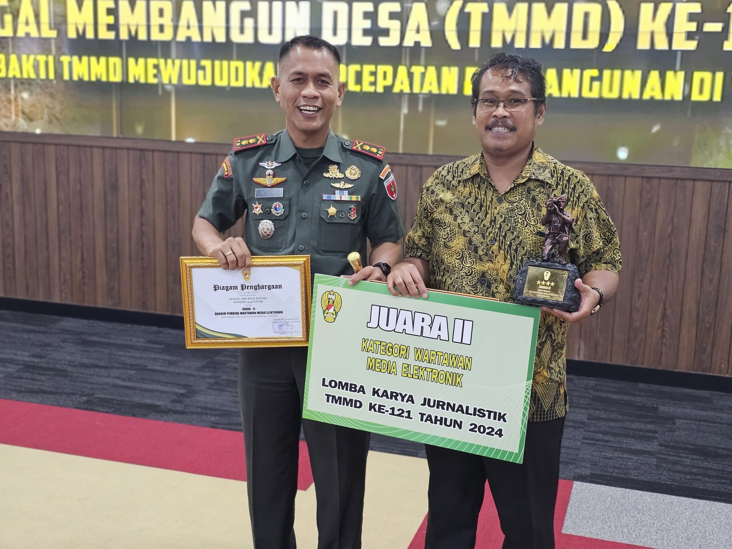 Kodim 1414/Tator berhasil meraih Juara 2 Lomba Karya Jurnalistik Kategori Wartawan Media Eletronik pada kegiatan TMMD Ke-121, Penghargaan tersebut diterima langsung oleh Dandim 1414/Tator, Letkol Arm Bani K. Sepang yang juga selaku pembina wartawan media elektronik bersama dengan Saudara Joni Banne Tonapa Wartawan dari TV One.
