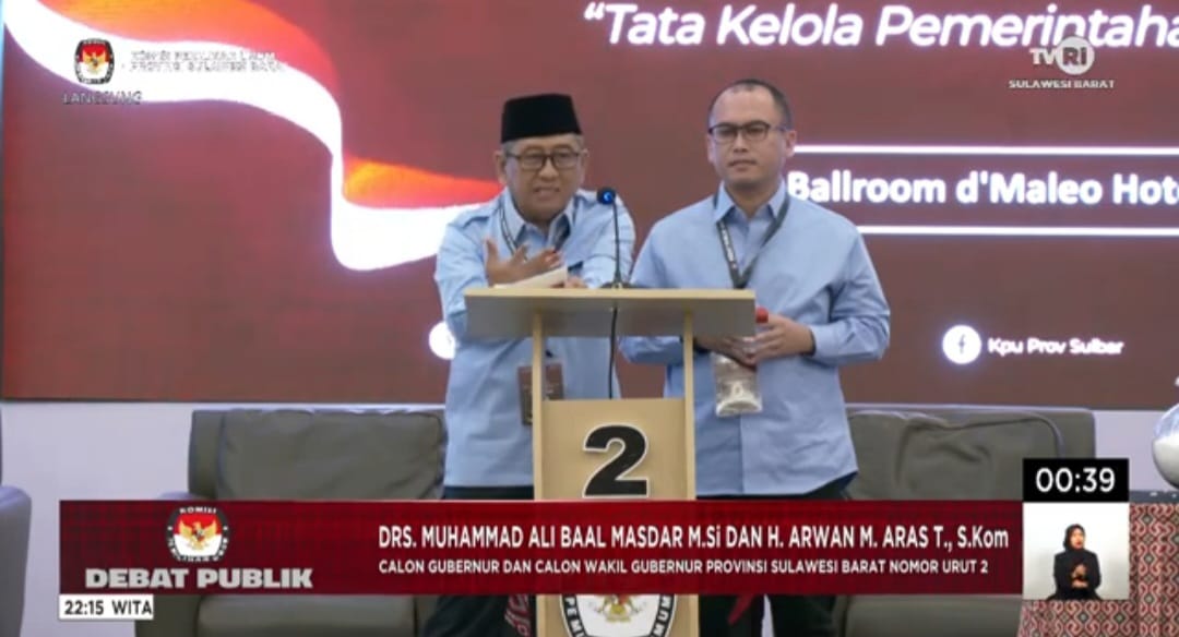 Mamuju-Jurnaltivi.com-Dalam debat kandidat Calon Gubernur (Cagub) Sulawesi Barat (Sulbar) dan Calon Wakil Gubernur (Cawagub) Sulbar, nomor urut 2, Ali Baal Masdar (ABM)-Arwan Aras, dihadapan rivalnya, berjanji jika terpilih kembali pimpin Sulbar akan tingkatkan Tunjangan Kinerja ASN dan akan memberantas korupsi.