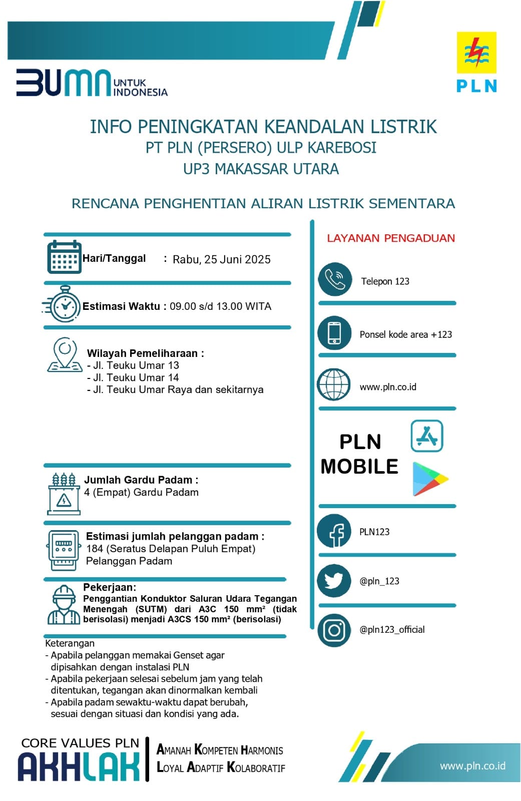 Mohon maaf atas ketidak nyamanannya dan pemeliharaan jaringan ini merupakan bagian dari komitmen PLN dalam memberikan pelayanan terbaik kepada pelanggan. Apabila bapak/ibu memerlukan informasi lebih lanjut, dapat menghubungi Call Center 123 atau dapat mendownload aplikasi PLN Mobile