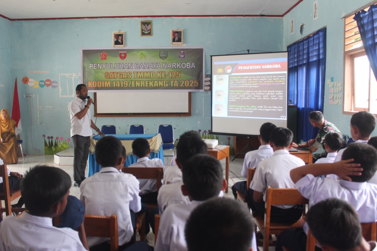 Enrekang, Jurnaltivi.com – Satgas TNI Manunggal Membangun Desa (TMMD) ke-125 Kodim 1419/Enrekang tidak hanya fokus pada pembangunan fisik, namun juga aktif melaksanakan kegiatan non fisik. Salah satu kegiatan yang digelar adalah penyuluhan tentang bahaya penyalahgunaan Narkoba, psikotropika, obat-obatan terlarang, dan zat adiktif lainnya kepada para pelajar.