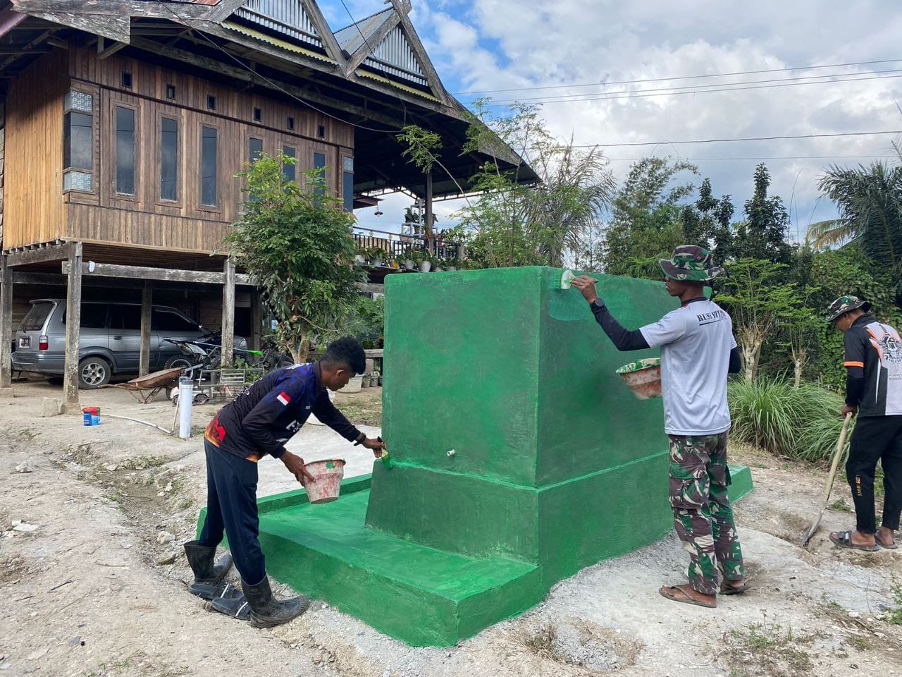 Kegiatan pengecatan dilakukan secara gotong royong oleh para prajurit Satgas TMMD, mulai dari bagian atas tower hingga detail interior kolam, guna memberikan perlindungan.