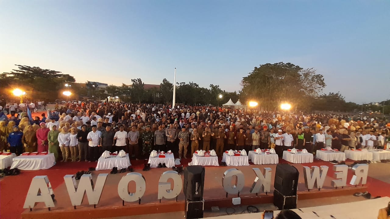 JURNALTIVI.COM, GOWA – Ratusan peserta dari berbagai elemen masyarakat mulai dari instansi pemerintah, TNI, Polri, Partai Politik, Ormas berkumpul di Lapangan Sultan Hasanuddin, Sungguminasa, Selasa (2/9), ikrarkan persatuan dan damai di Kabupaten Gowa, Sulsel.