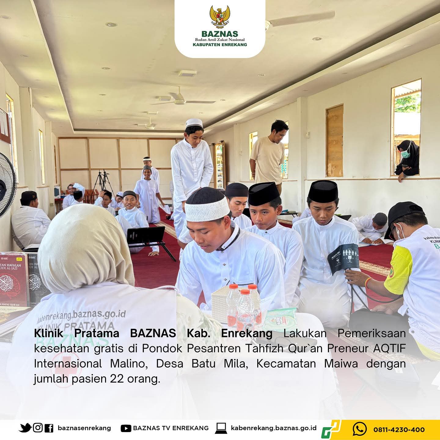 Enrekang, Jurnaltivi.com – Klinik Pratama BAZNAS (Badan Amil Zakat Nasional) Kabupaten Enrekang menunjukkan komitmennya dalam meningkatkan derajat kesehatan masyarakat dengan menyelenggarakan kegiatan penyuluhan dan pemeriksaan kesehatan gratis bagi santri serta pengurus Pondok Pesantren (Ponpes) Tahfizh Qur’an Preneur AQTIF Internasional Malino. Kegiatan ini dilaksanakan beberapa waktu lalu di ponpes yang terletak di Desa Batu Mila, Kecamatan Maiwa, Kabupaten Enrekang, Sabtu (04/10/2025).