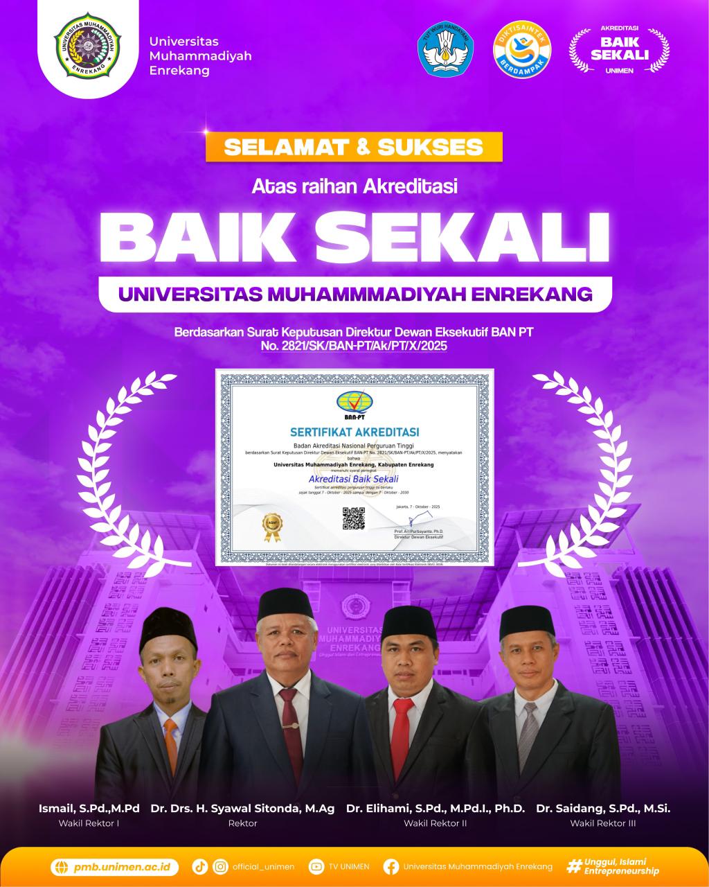 Enrekang, Jurnaltivi.com – Kabupaten Enrekang patut berbangga pasalnya perguruan tinggi satu-satunya yang dimilikinya yakni Universitas Muhammadiyah Enrekang (UNIMEN) kini telah memperoleh status Akreditasi Baik Sekali dari Badan Akreditasi Nasional Perguruan Tinggi (BAN PT).