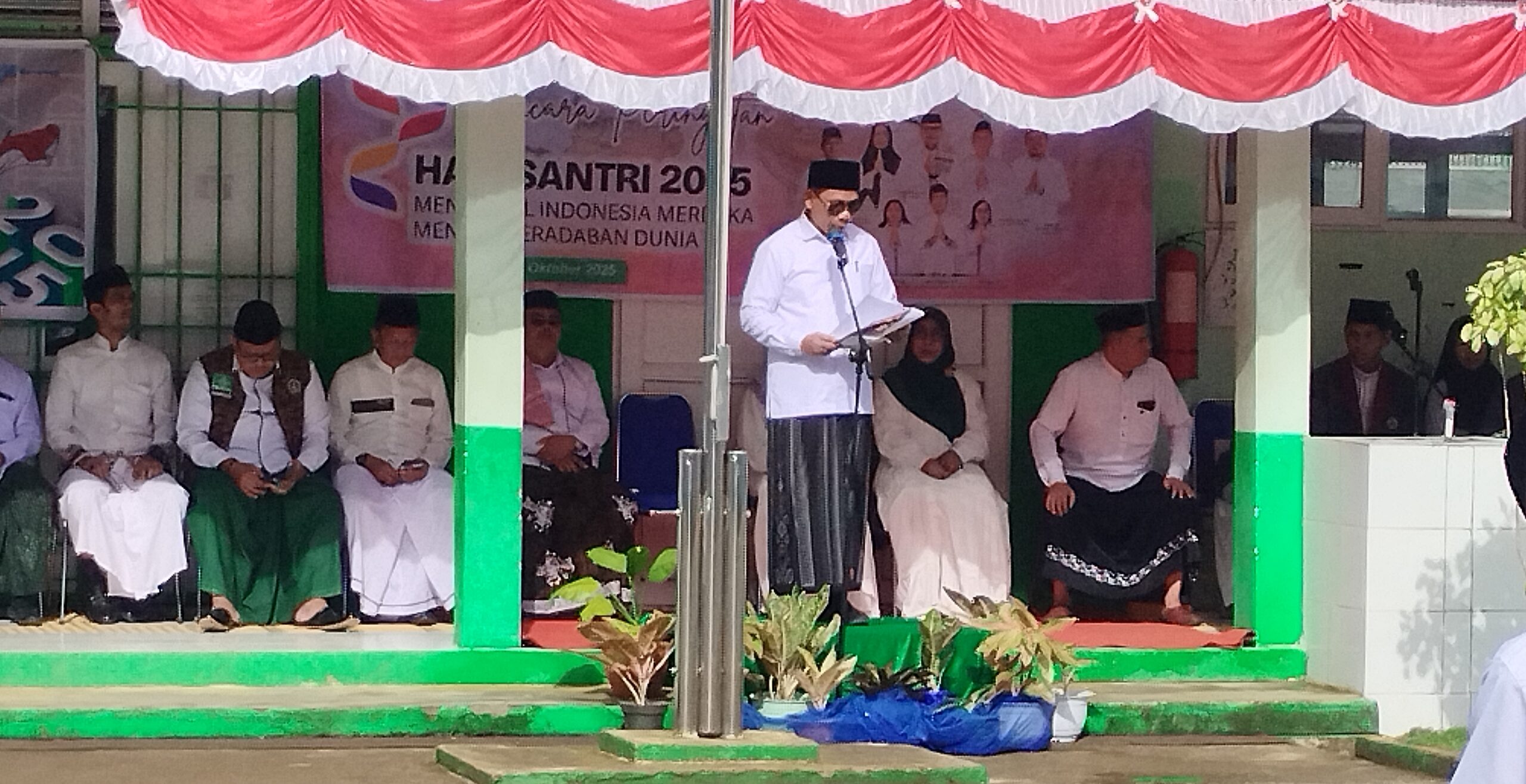 Pengibaran bendera merah putih dilangsungkan oleh paskibraka dari santri yang terpilih. Prosesi pengibaran bendera merah putih dilangsungkan secara khidmat oleh ribuan santri yang mengikuti perayaan Hari Santri yang ke X.