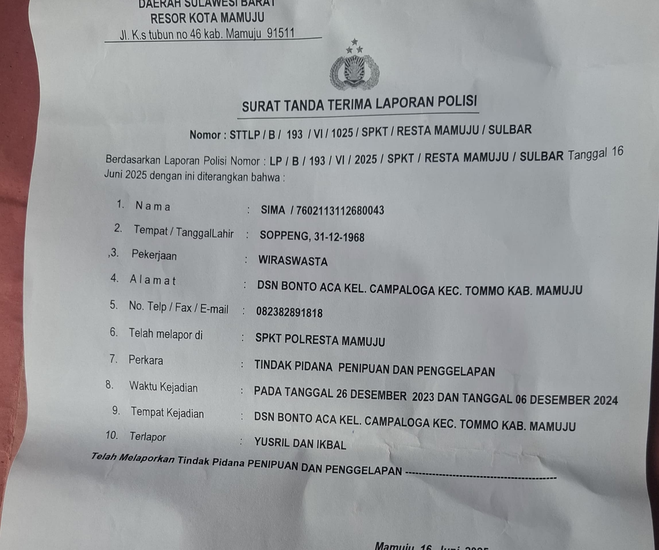 “Saya sudah membuat laporan polisi di Polresta Mamuju sejak Bulan Juni lalu, namun hingga sampai hari ini belum ada titik terang dari laporan polisi yang saya buat,” ungkap H Sima, yang dihubungi wartawan media ini melalui sambungan telepon, Senin (10/11/2025).
