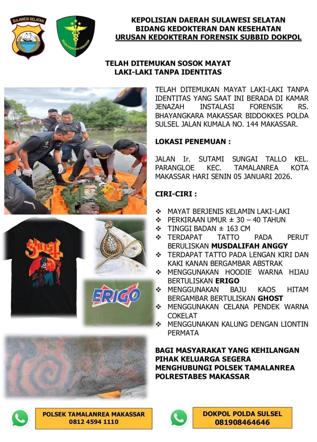 ” Dari informasi jasad tanpa identitas yang ditemukan warga yang sedang menjala ikan sekitar sungai Tallo, melihat sesosok mayat yang mengapung langsung menghubungi pihak polsek.” Kata Ipda Sultan Dantim Dokpol Biddokkes Polda Sulsel, kepada media.