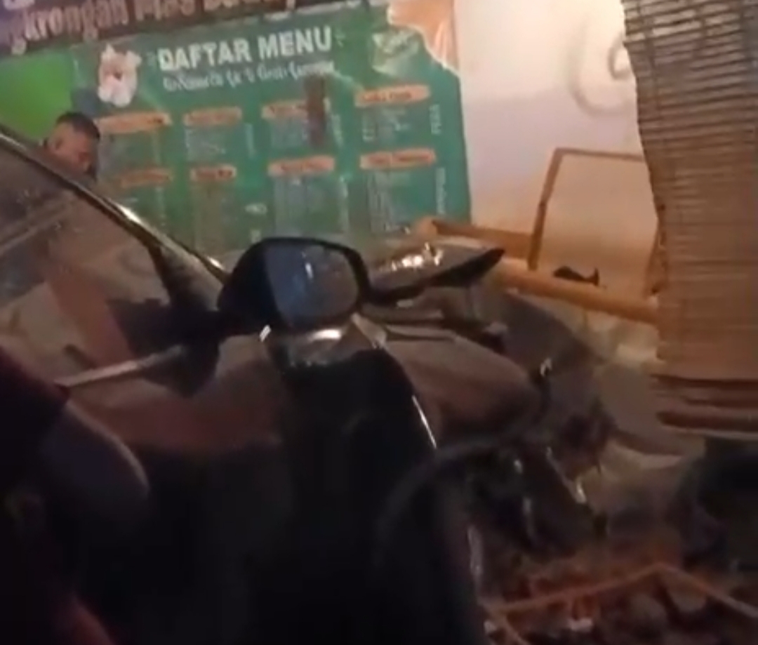 Di dalam warung Lamongan ada 3 motor yang parkir dan ada dua remaja yang lagi duduk santai. Tiba tiba mobil milik Pemkab Mamuju tersebut menyeruduk motor dan dua orang laki laki tersebut.